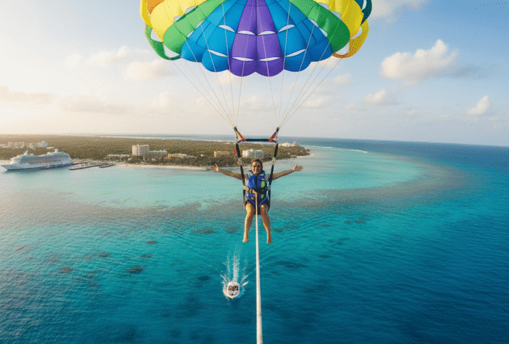 Parasailing in cozumel takes you 500 feet above the beautiful Caribbean ocean. Soaring high above crystal clear water and worries in the earth high. This tour is great for beginners! Secure your solo or tandem Cozumel Parasailing flight today